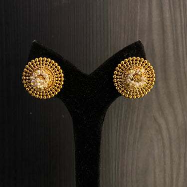 These magnificent oversize studs are a true statement earring, crafted in silver and finished with a warm gold tone. They feature a grand, intricately detailed floral motif, where each sculpted blossom is centered with a luminous freshwater pearl, creating a beautiful play of texture and light. For a look of modern regality, pair these earrings with a high-neck blouse and a bold silk sari, allowing their substantial scale and elegant pearl accents to create a powerful and sophisticated focal point.All Handcrafted Products Are Imperfectly Perfect.