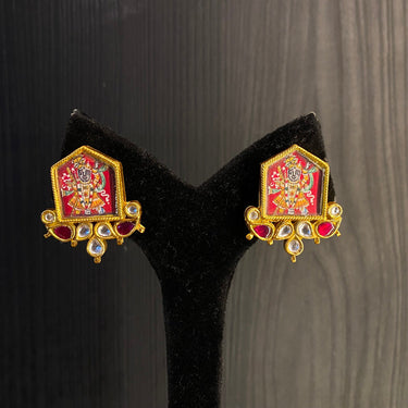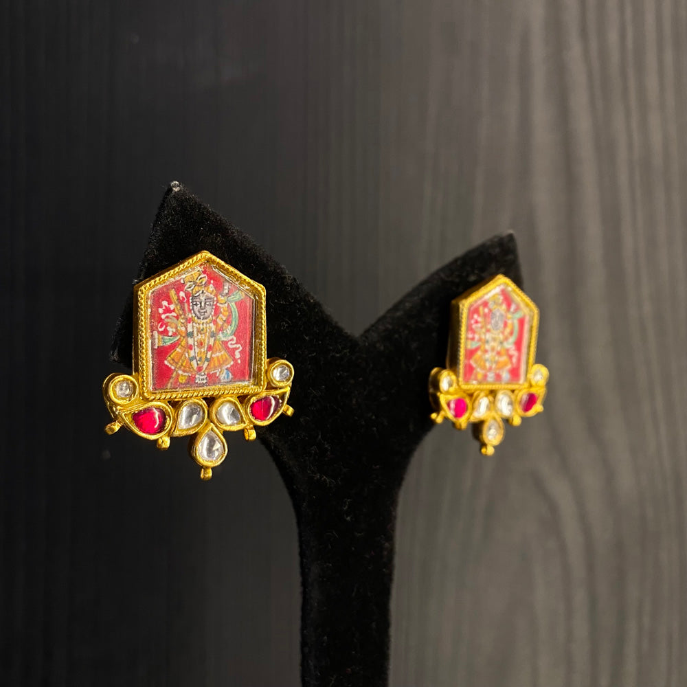 These exquisite handmade heritage jewellery pieces are sterling silver stud earrings, finished in a warm gold tone, that serve as miniature canvases for devotion. Each stud meticulously frames a tiny, detailed painting of Shrinath Ji, with the divine image beautifully bordered by the radiant sparkle of kundan. For a touch of spiritual elegance, wear these studs with a traditional Parsi gara silk sari or a finely woven Kota doria saree, allowing their sacred art to add a profound and personal grace to your ensemble.All Handcrafted Products Are Imperfectly Perfect.