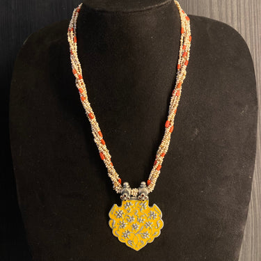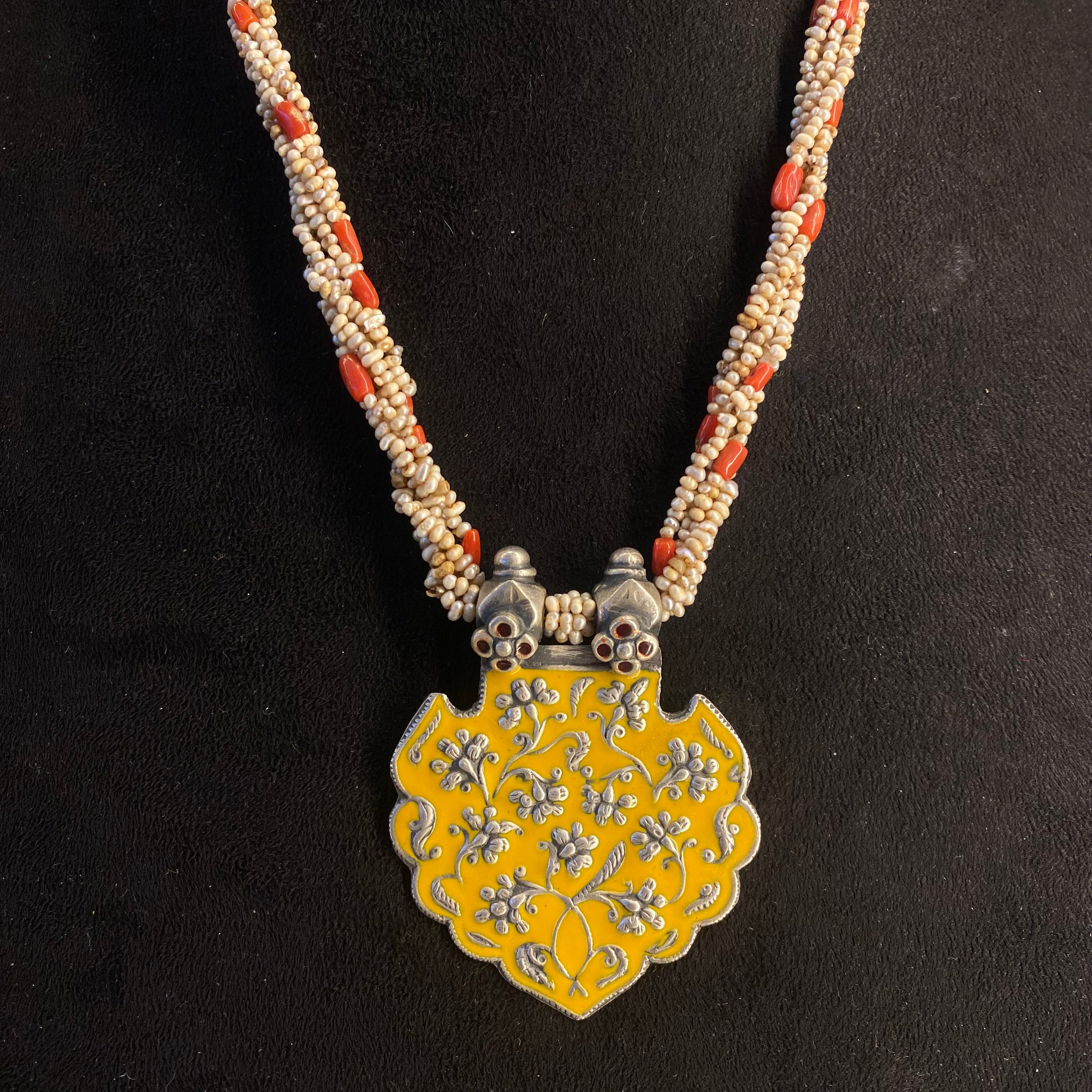 This exquisite silver necklace is a harmonious fusion of organic inspiration and tribal artistry, designed in the form of a substantial mala. It features a distinctive tribal pendant adorned with intricate floral and leaf-shaped motifs, each brought to vibrant life with the colorful artistry of meenakari enamel work. The pendant is elegantly integrated into a strand that combines the soft luster of freshwater pearls with the natural, vivid warmth of coral beads. This blend of metallic craftsmanship, vibrant color, and natural elements creates a piece that is both a spiritual garland and a wearable celebration of boho elegance.