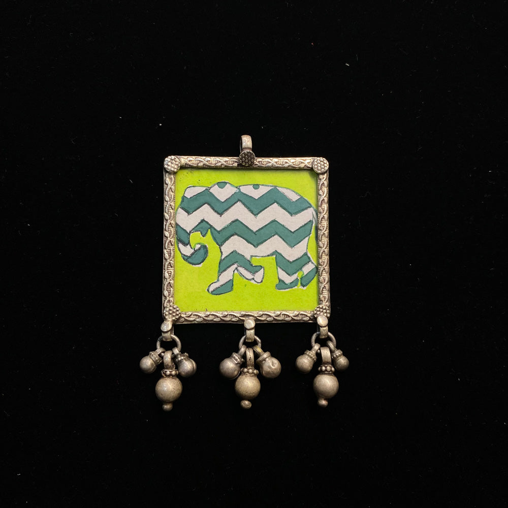 This unique tribal pendant features a detailed elephant motif held within a solid silver frame. Delicate ghungroos are attached, adding a soft, rhythmic charm to this carefully crafted silver pendant.