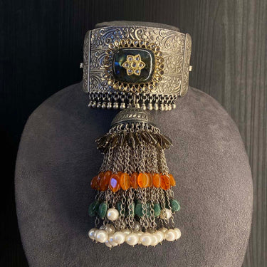 This dual tone silver necklace, designed as a striking silver choker, is a true heritage choker that embodies timeless craftsmanship. Adorned with elegant jhumki motifs and finished with delicate chain tassels, it creates a fluid play of movement and charm. The choker is further elevated with lustrous pearls, vibrant semi-precious stones, bold onyx accents, and the sparkle of kundan. Intricate floral motifs add a touch of grace, making this piece a perfect blend of tradition, artistry, and statement elegance.Disclaimer: All Handcrafted Products Are Imperfectly Perfect.