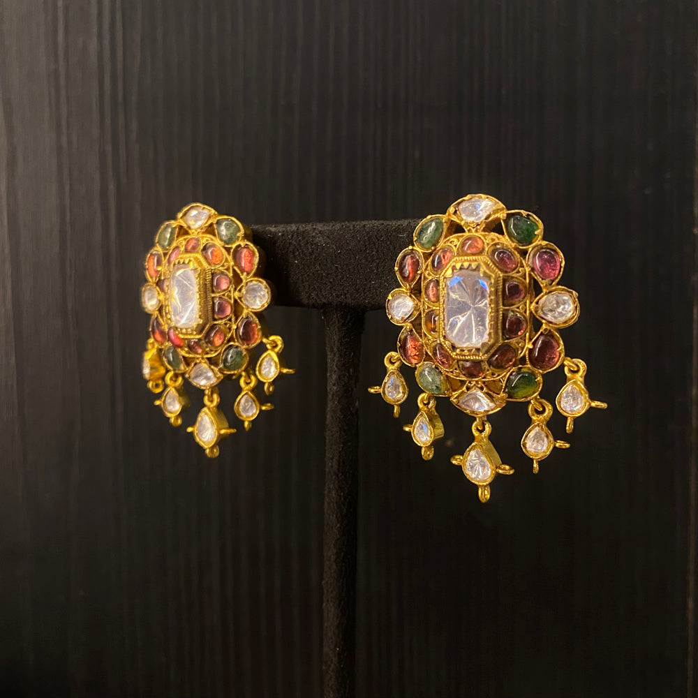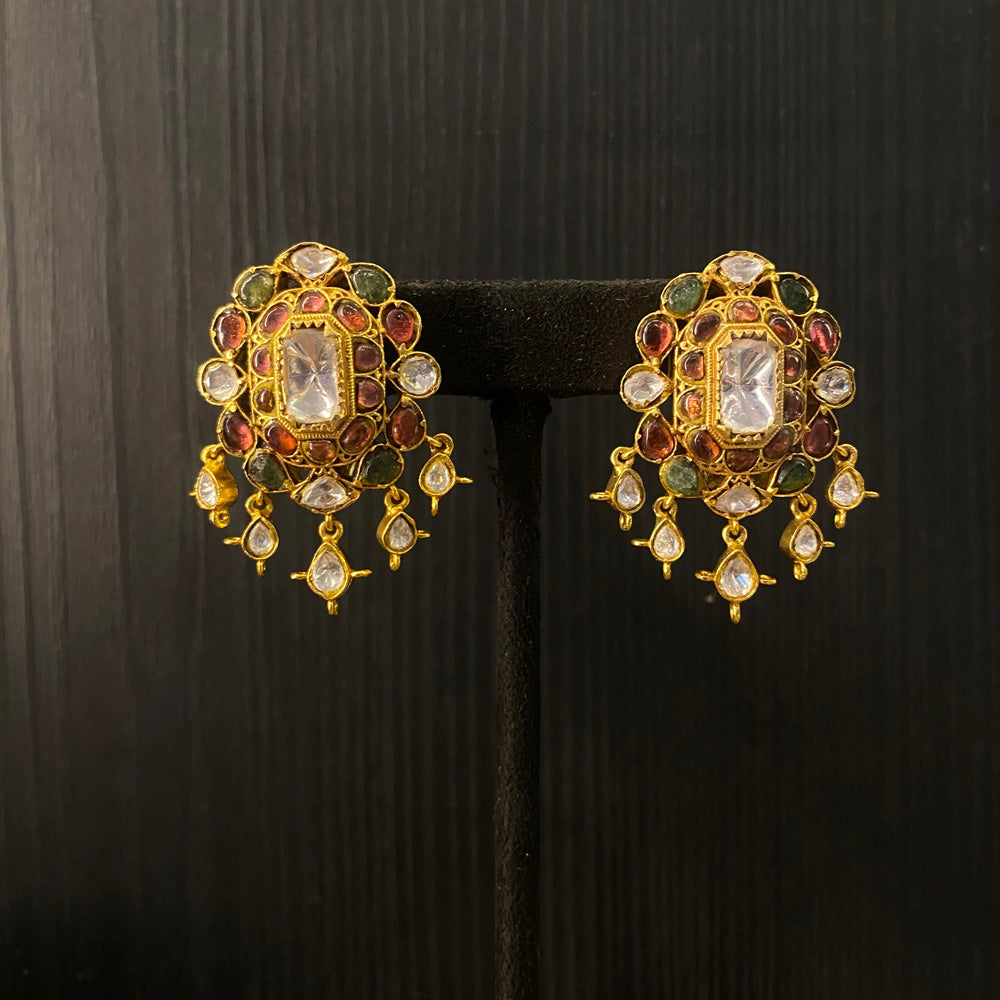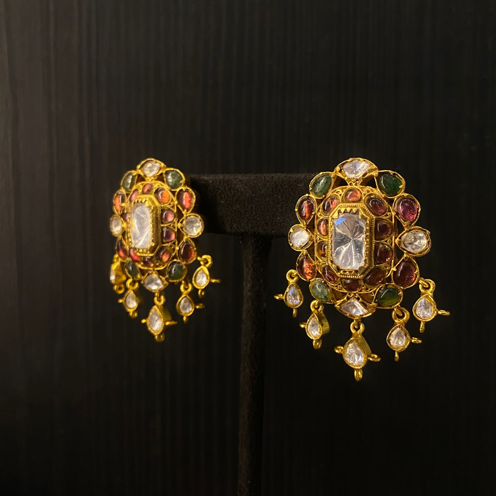 These exquisite silver earrings, crafted as elegant studs, are imbued with a distinct old-world charm. Their form, rendered in a warm gold tone, provides a rich canvas for the central floral motif. This delicate design is brought to life with the timeless sparkle of kundan, where each polished gem is set with precision. Accents of semi-precious stones add subtle color and depth, enhancing the intricate pattern. Together, these elements create a pair of earrings that are not merely accessories, but small pieces of wearable history, perfect for adding a touch of vintage grace to any ensemble.