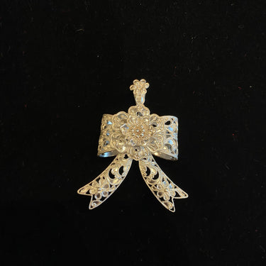 This unique silver brooch presents a delightful play of dimension, featuring a meticulously sculpted 3D bow motif intertwined with an equally detailed 3D floral bloom. The artistry is in the lifelike folds of the ribbon and the delicate, layered petals, all crafted with striking realism in sterling silver. This harmonious blend of classic elegance and modern structure creates a statement piece that is both whimsical and sophisticated. Its versatile design makes it a captivating accessory, perfect for adding a touch of three-dimensional artistry to a blazer, dress, or handbag.