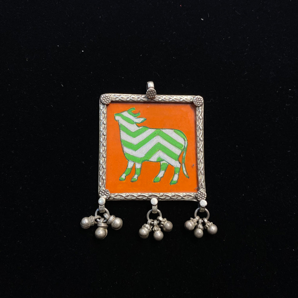 This distinctive tribal pendant features a silver frame that elegantly showcases a detailed cow motif. Tiny ghungroos are thoughtfully incorporated, adding a gentle chime to this reverent and handcrafted silver pendant.