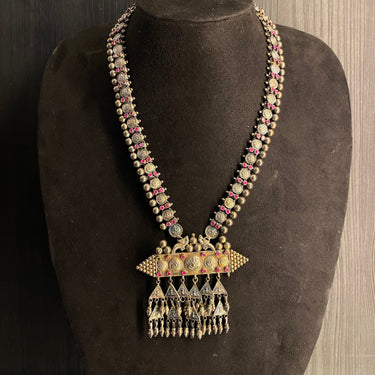 This gold tone tribal necklace celebrates the free-spirited essence of boho and tribal jewellery through its authentic design. It is adorned with distinctive tribal motifs, each telling a story of ancient craftsmanship and cultural heritage. Tiny ghungroo bells are interspersed throughout, adding a layer of playful movement and soft sound with every wear. The piece is a bold fusion of raw artistry and contemporary style, making it a definitive statement for the modern bohemian spirit.