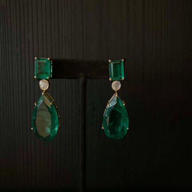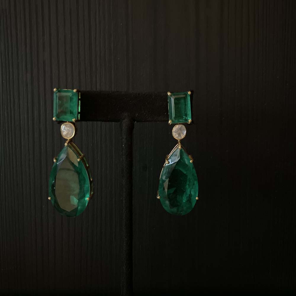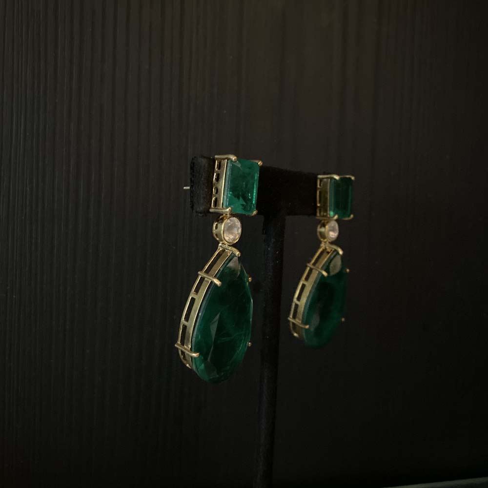 Add a hint of heritage to your look with these silver earrings, artistically finished with Gold tone, Emerald, white semi precious stone, Drop shaped stone. for an artisanal flair. Material Used: Silver Disclaimer: All Handcrafted Products Are Imperfectly Perfect.