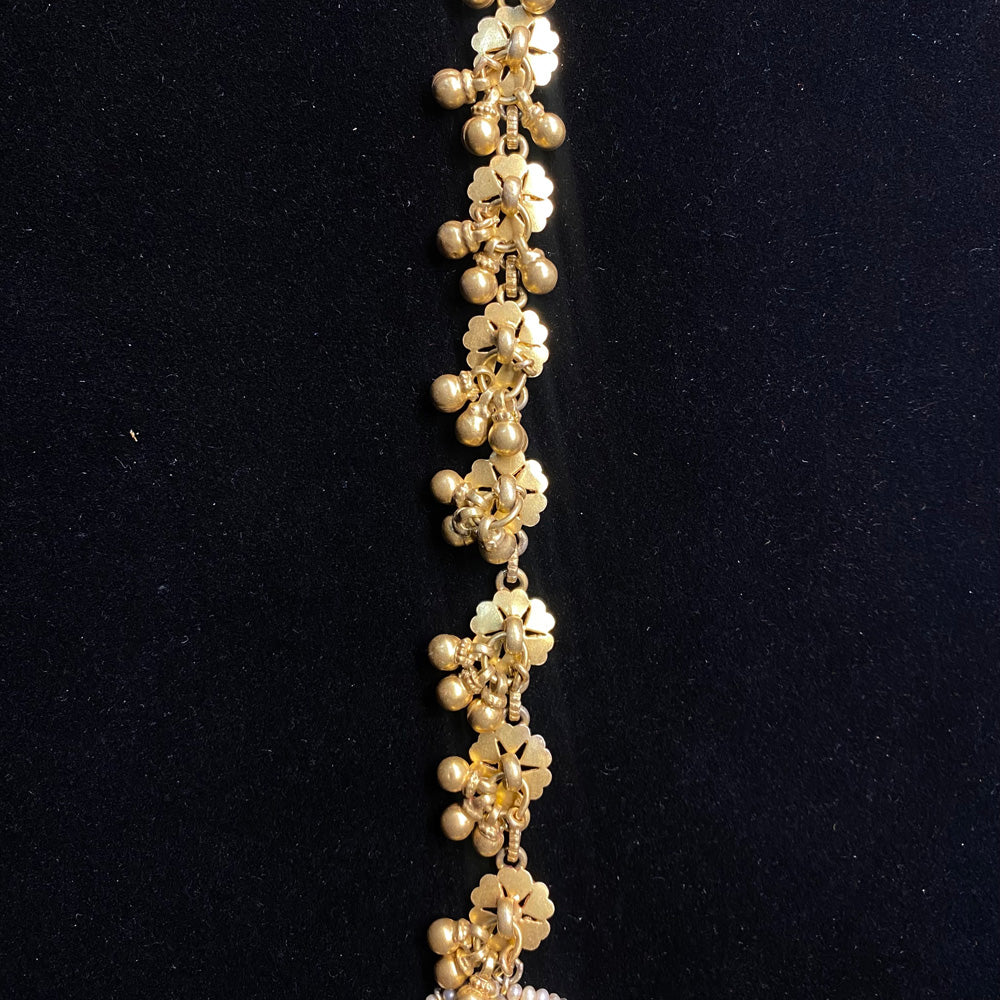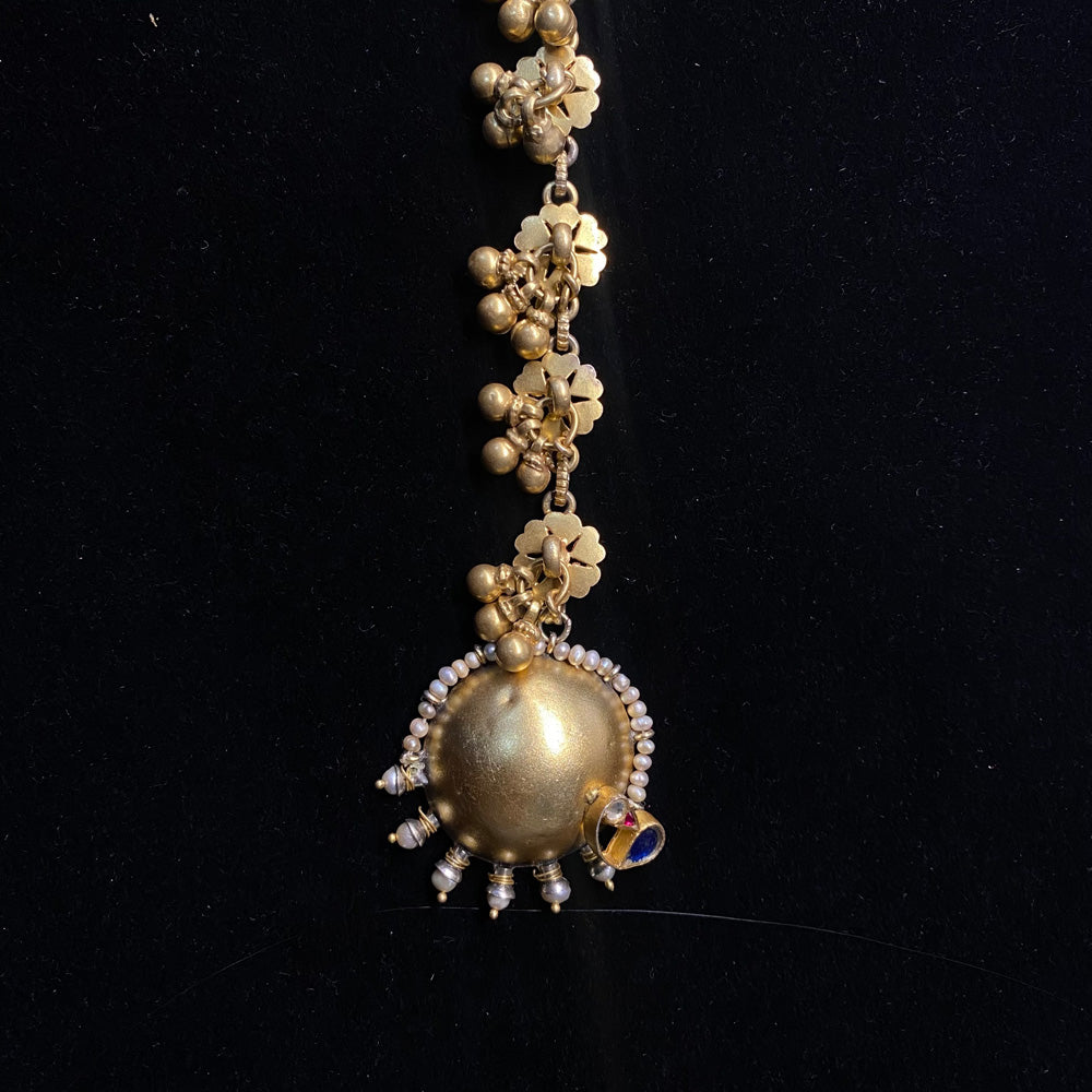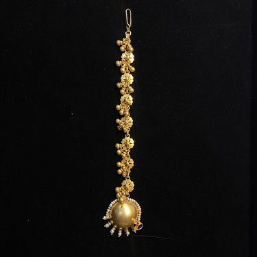This exquisite gold tone mangtika features a delicate parrot motif adorned with freshwater pearls, complemented by subtle circular and tribal motifs that dance with the gentle chime of tiny ghungroos, creating a perfect piece of traditional jewellery. You can effortlessly pair this stunning accessory with a simple silk saree or a solid-colored kurta to let its intricate craftsmanship truly stand out. Disclaimer: All Handcrafted Products Are Imperfectly Perfect.